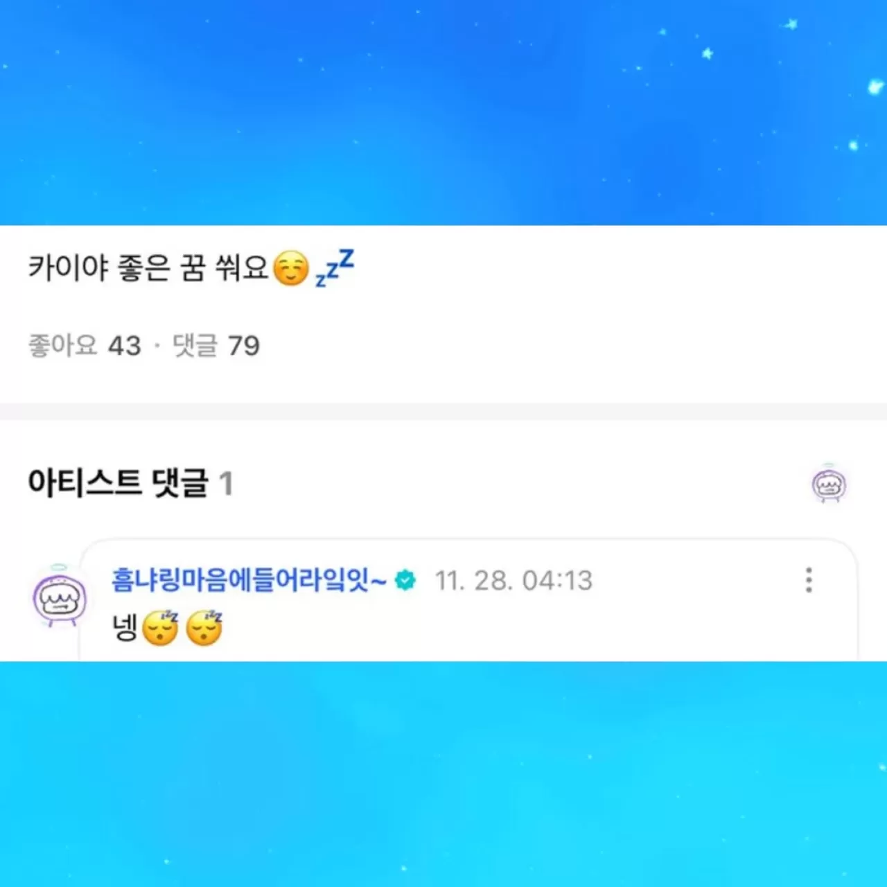 Sohbet sırasında bir hayranın "Huening Kai, tatlı rüyalar" dileğine Kai, "Evet" yanıtıyla karşılık verdi. Bir başka hayran ise uyumadan önce "Seni seviyorum" demesini rica etti. Huening Kai da bu isteği geri çevirmeyerek "Seni seviyorum" şeklinde cevapladı. Bu kısa diyalog, sanatçı ile hayran kitlesi arasındaki sıcak iletişimin bir örneği olarak dikkat çekti.